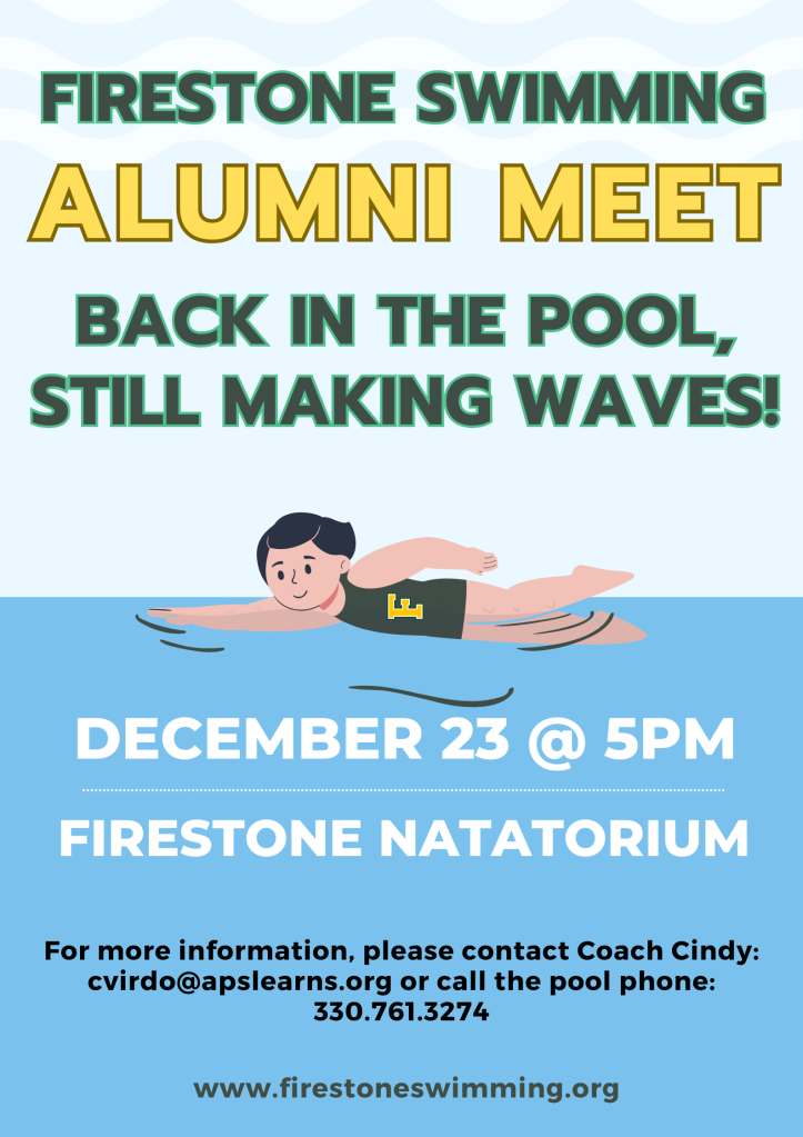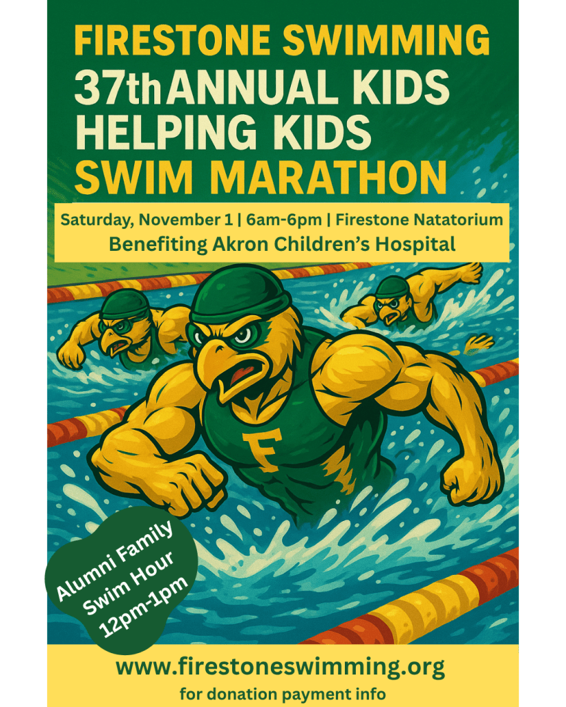 We’re calling on all Firestone Swim Team alumni to dive in and swim from 2:00 PM to 3:00 PM to show your support for the team and the community. Let’s come together to celebrate the legacy of Firestone swimming while making a difference for Akron’s children.